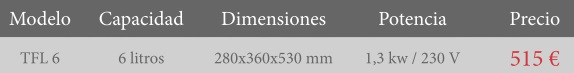 Pies regulables en altura. Temperatura regulable hasta 85ºC. Peso: 10 Kg.